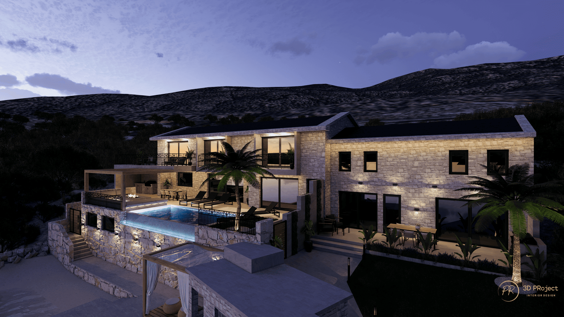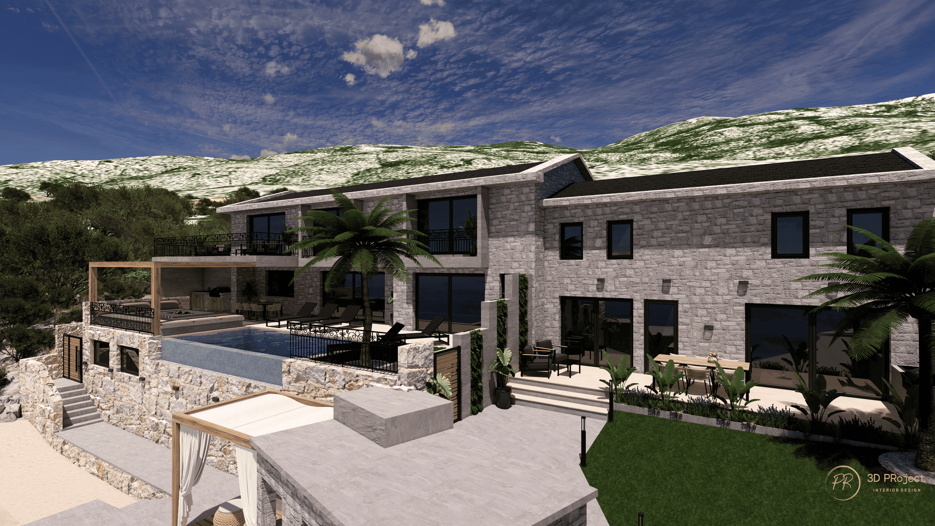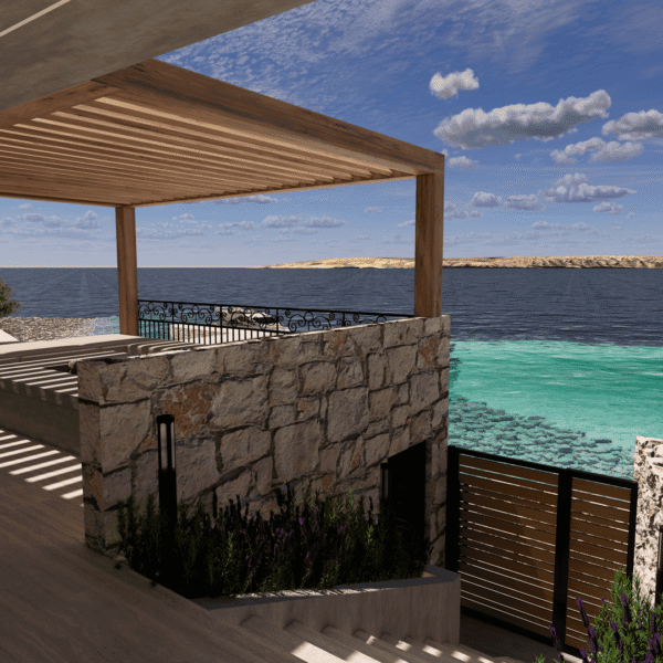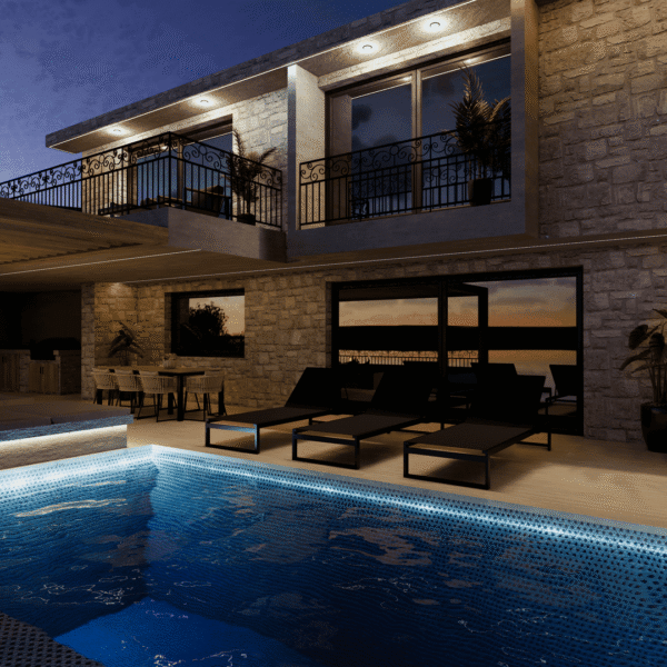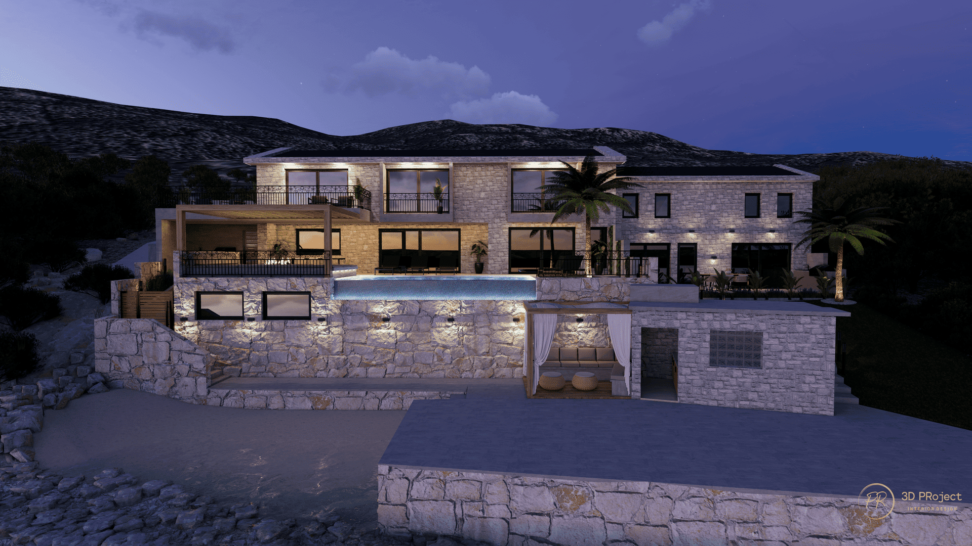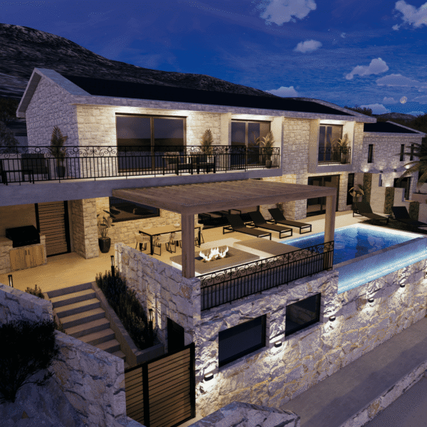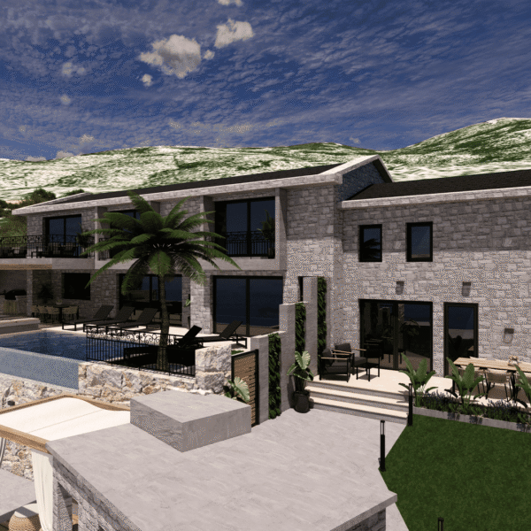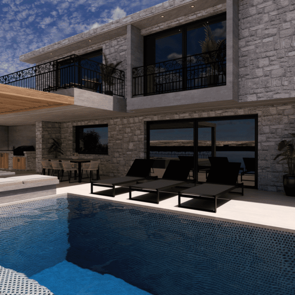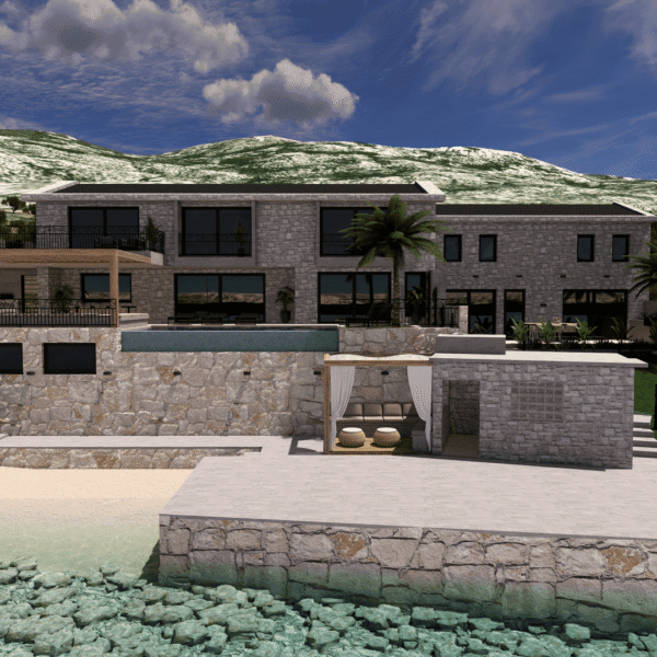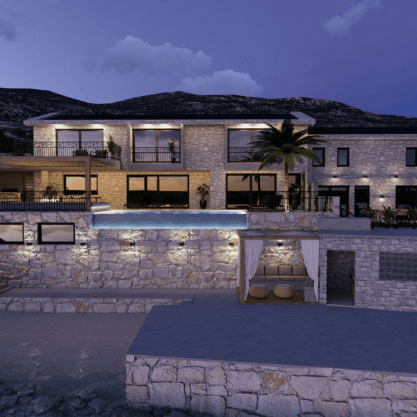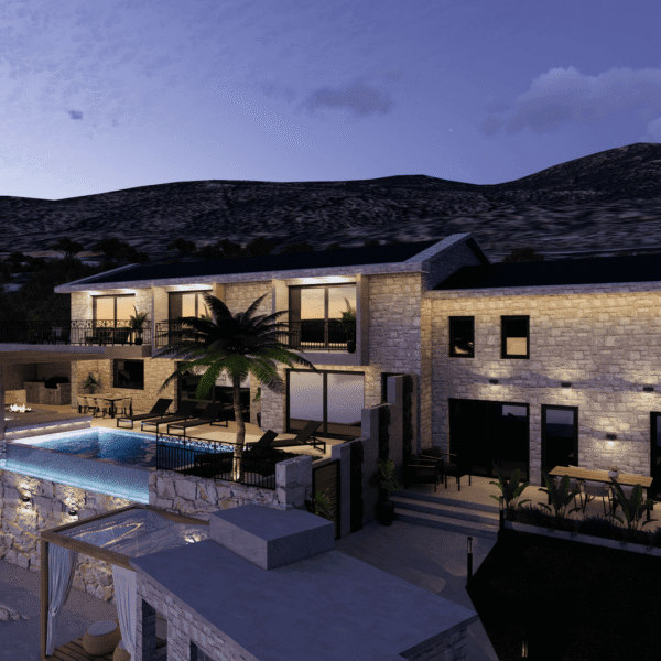 Projekt Lukovo predstavlja suvremenu interpretaciju mediteranske arhitekture, smještenu u zahtjevnom obalnom okruženju s naglaskom na vizure i prirodni kontekst. Kaskadno oblikovani volumeni, velike staklene površine i prostrane terase omogućuju snažnu povezanost interijera s morem i vanjskim prostorima. Posebna pažnja posvećena je funkcionalnoj organizaciji, privatnosti korisnika i korištenju materijala koji osiguravaju sklad s okruženjem i dugoročnu održivost.